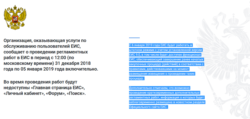 Во время проведения работ будут недоступны «Главная страница ЕИС», «Личный кабинет», «Форум», «Поиск».